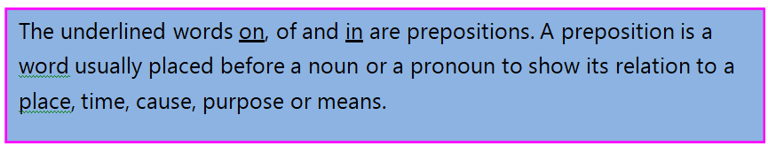 e.g. in, on, at, over, under, above, below, behind, between, beyond