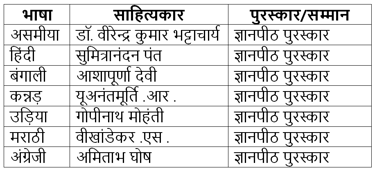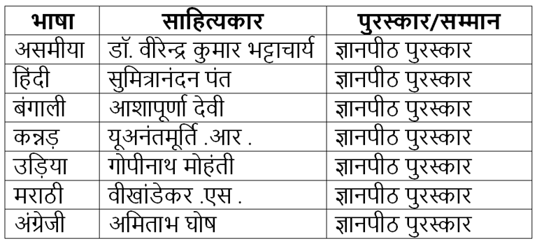 2. भारत की विभिन्न भाषाओं में रचित उत्कृष्ट साहित्य को विशिष्ट पुरस्कार या सम्मान से स्वीकृति दी जाती है। ज्ञानपीठ पुरस्कार, साहित्य अकादमी पुरस्कार आदि इस प्रकार के पुरस्कारों के उदाहरण हैं। नीचे दिए गए प्रारूप के अनुसार एक तालिका बनाओ :